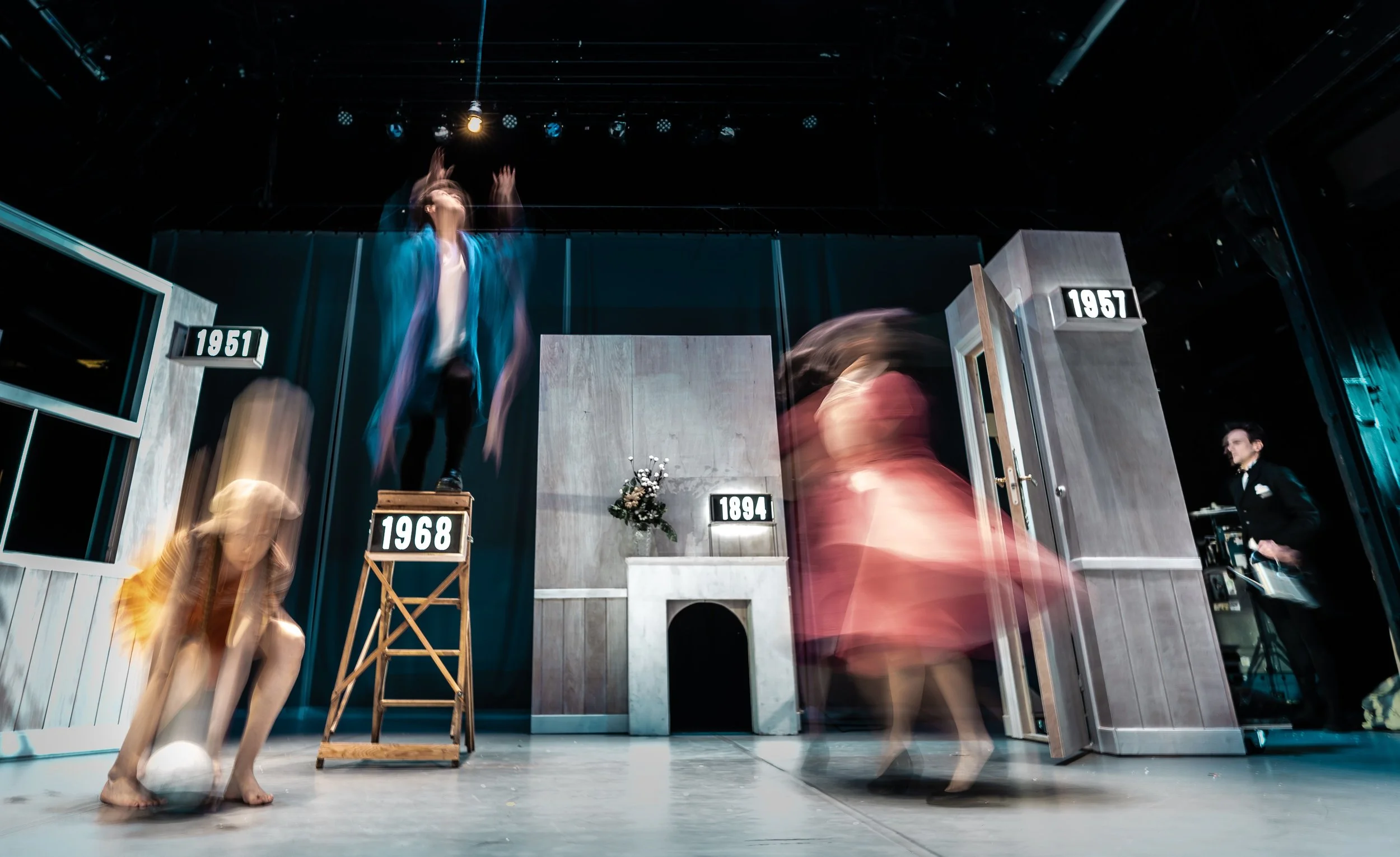 It takes place in a single location, 20 square meters of a living room, but on a massive timeframe - reaching deep into the past (80 006 032 BCE) and projecting into the future (7 billion CE). Multiple characters from different times coexist and interact in this space, and create an accumulation of cocktail parties, arguing couples, geiger counters, a fire, a flooding, arrivals and farewells.